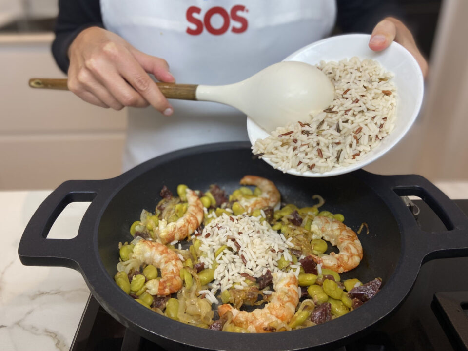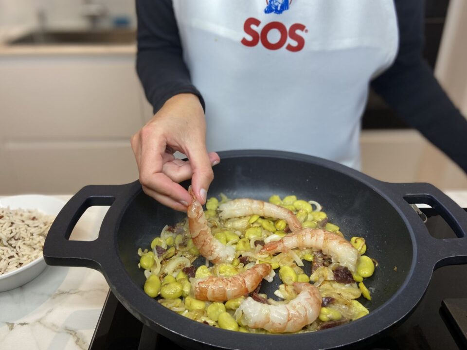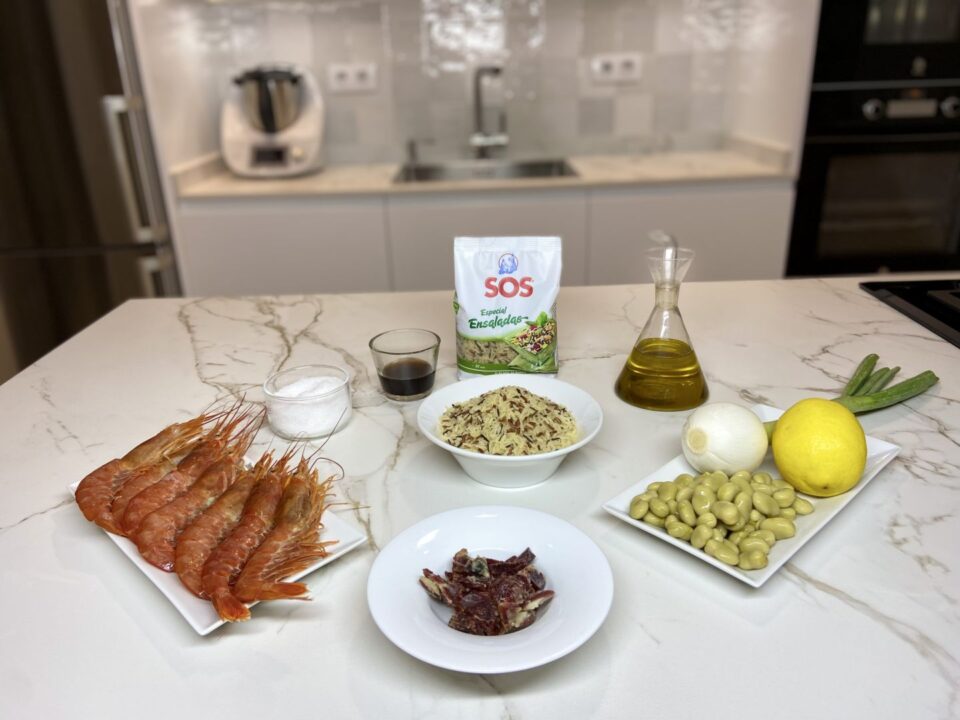 El ingrediente principal de esta ensalada de arroz con gambones y habitas con jamón es el Arroz SOS Especial Ensaladas, que es una mezcla de arroz largo, arroz salvaje -ligeramente crujiente- y arroz rojo integral, que le aportarán mucho color y textura a tu plato. Además, le hemos añadido unas gambones, que si prefieres podrás sustituir por langostinos o tus mariscos favoritos; unas habitas, que puedes cambiar por habas o guisantes, y jamón, que podría ser también jamón york. Todo esto para obtener una ensalada original y muy sabrosa.