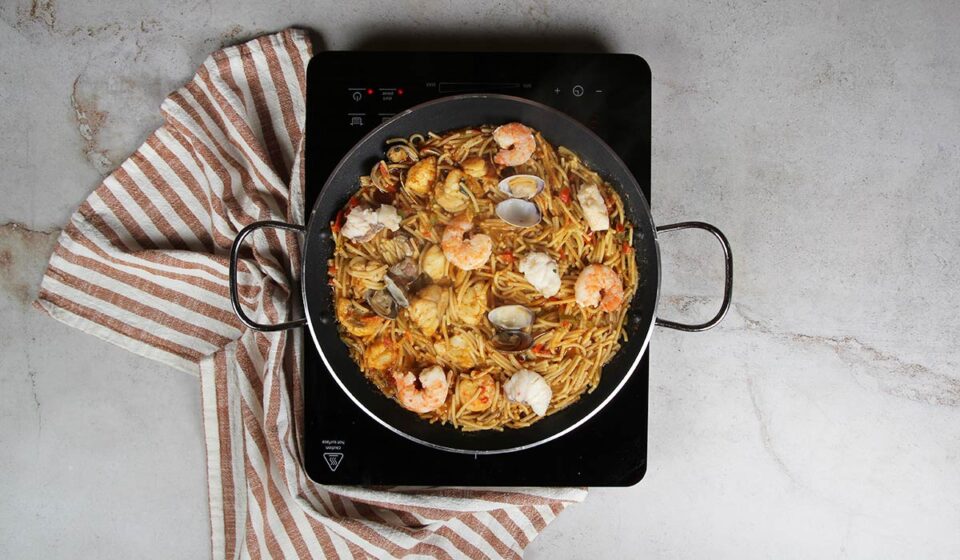 Llegó el momento de darle vida a nuestra fideuá de marisco de la abuela. En tu sartén principal, esa que te ha acompañado en tantas batallas culinarias, añade los fideos y mezcla con el sofrito. Es como un baile de sabores que promete, y además es un truco infalible para que los fideos absorban todo ese sabor maravilloso.