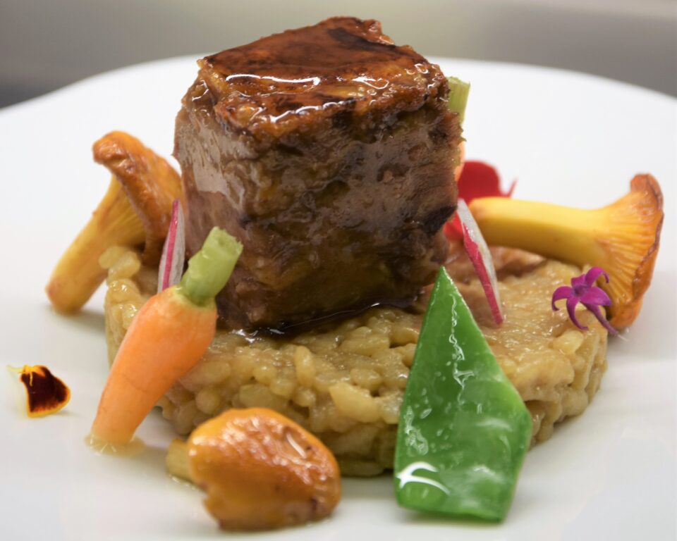 A la hora de emplatar, te recomendamos que cortes el capón en cubos y dores en la sartén por la parte de la piel. Prestando atención a todo lujo de detalles, te proponemos que dispongas el arroz en el centro del plato con el capón.
