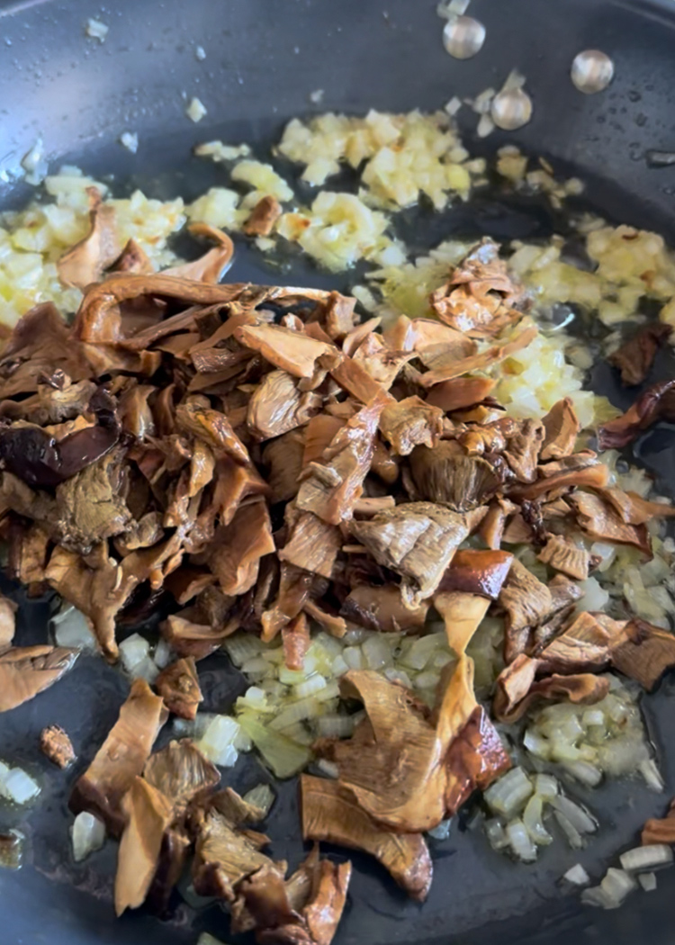 Calienta un poco de aceite y deja que la cebolla se vaya poniendo transparente, sin prisas, como quien charla mientras remueve. Cuando empiece a oler a cocina casera, añade los boletus y mézclalos bien. En un par de minutos verás cómo su aroma llena la sartén; ese es el momento en el que sabes que la cosa va por buen camino.